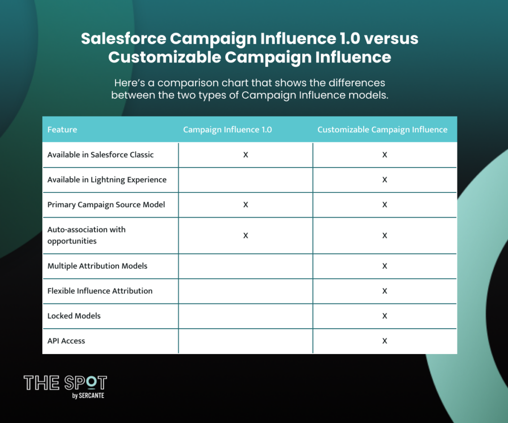 Here’s a comparison chart that shows the differences between the two types of Salesforce Campaign Influence models.