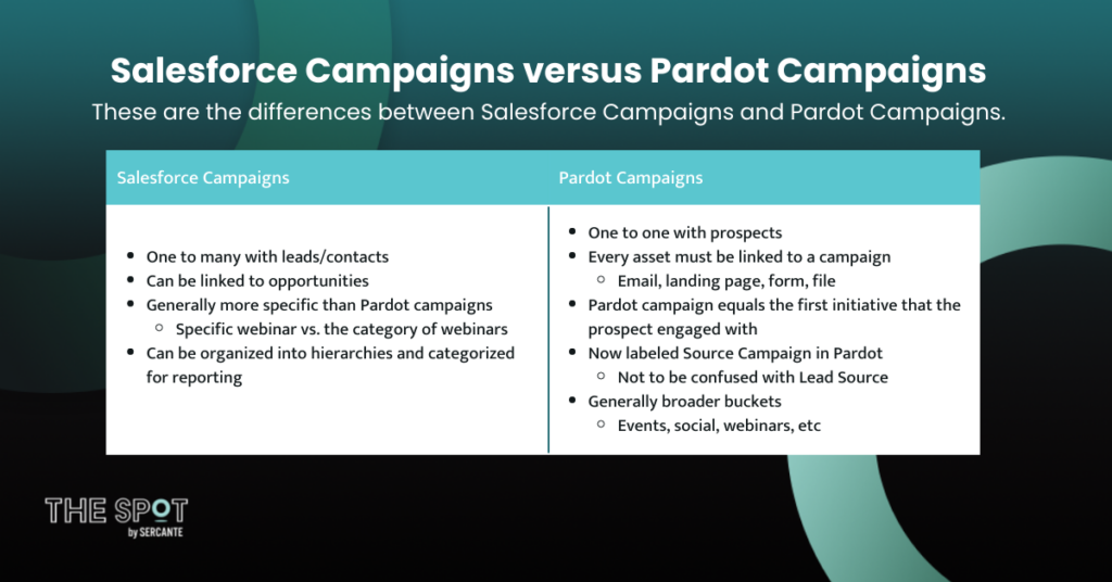 Here’s a chart that compares the differences between Salesforce and Pardot campaigns:
