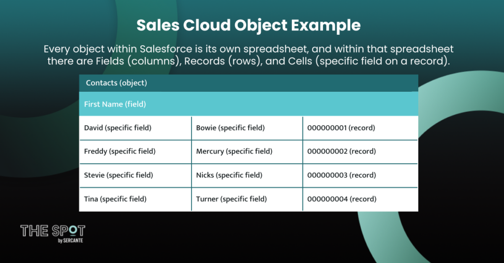 When you think of it in that way, it’s so much simpler when you first login and start navigating the CRM. Every object within Salesforce is its own spreadsheet, and within that spreadsheet there are Fields (columns), Records (rows), and Cells (specific field on a record).