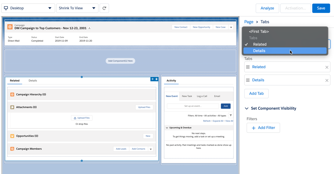 By default, when you navigate to a campaign in Salesforce, the default tab will be the Related tab. You can update the default tab to be anything you want. I recommend setting it to the Details tab. To do this, click on the tabbed section and chose the default tab from the dropdown.