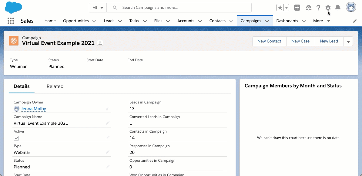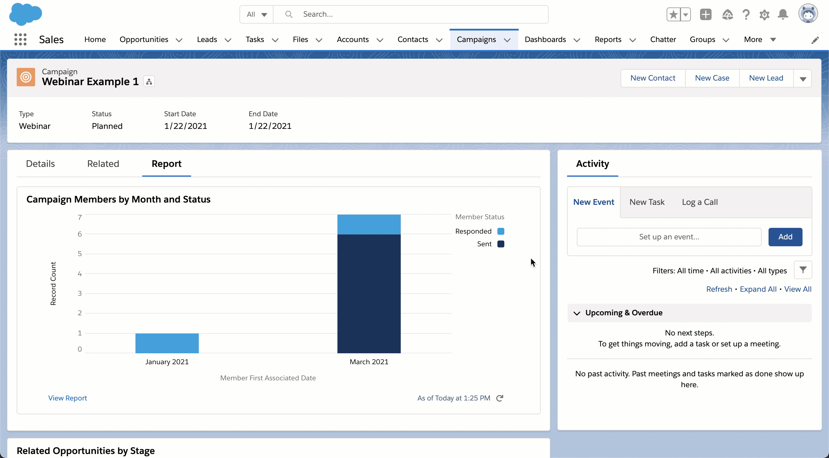 Adding report charts will give you insight into a particular campaign’s performance without creating a separate report or leaving the campaign page. These reports can show you how many campaign members were added, by month or by status, how many opportunities are influenced by the campaign by opportunity stage, etc.