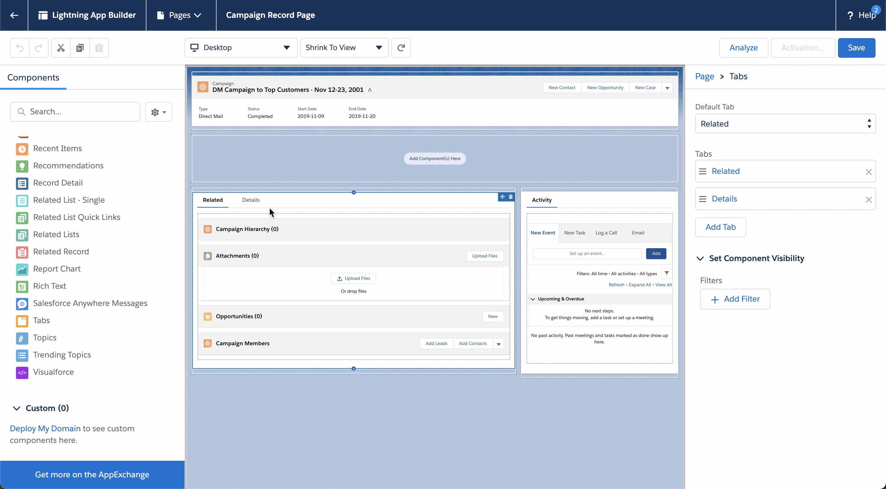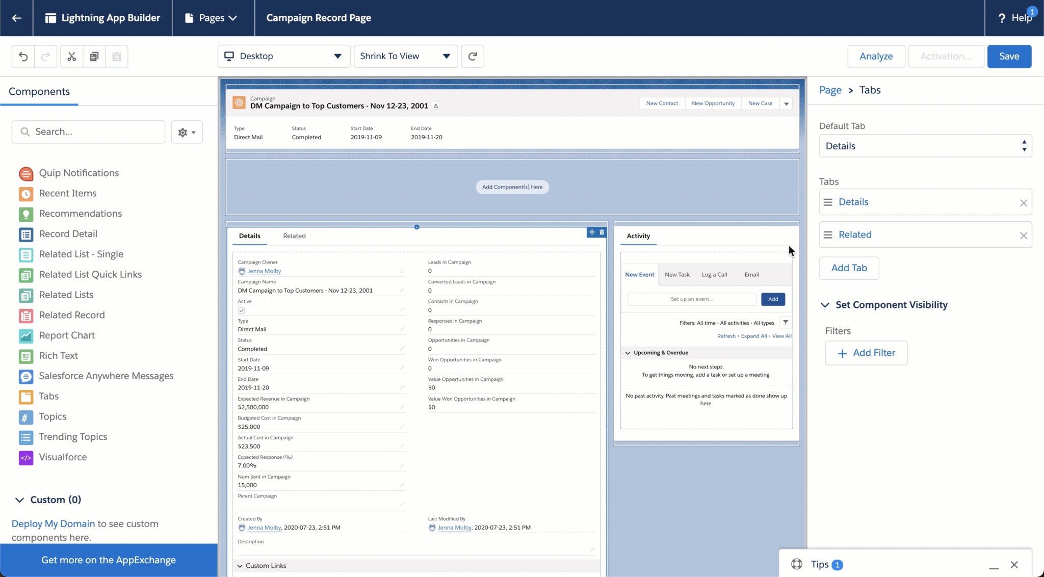 One of my favourite Lightning features is customizing the campaign page using the Lightning App Builder. The drag-and-drop App Builder allows you to add tabs, reports and instructions to your page. While there are many different ways to customize your campaign page, here are four changes that are easy to implement that will delight your marketing team.