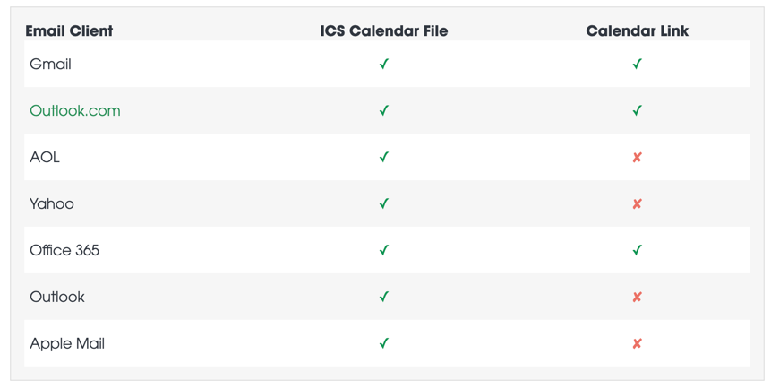 Here’s the breakdown of which email client accepts which ‘add to calendar’ method.