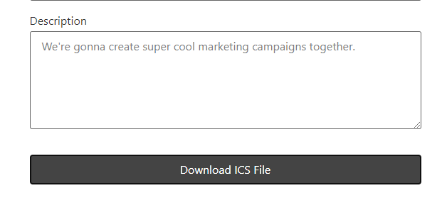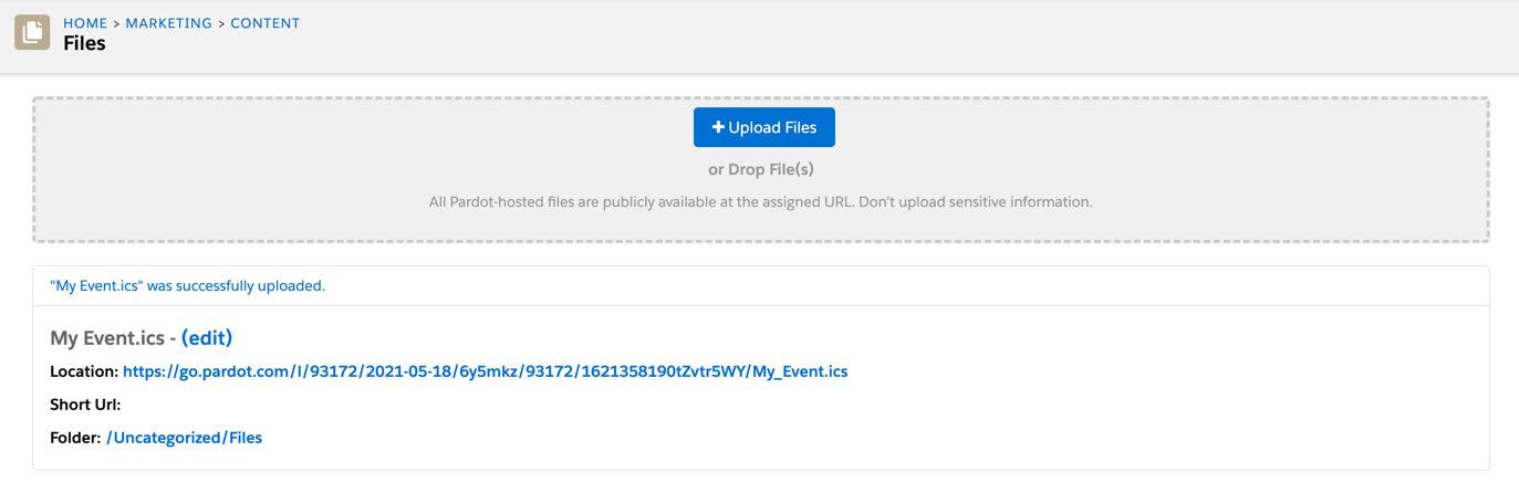If you want to target an email client that supports ICS files, you will need to generate the file and upload it into Pardot. Using the same generator, click on the download ICS button to download the file. Upload the file into Pardot (Marketing > Content > Files).