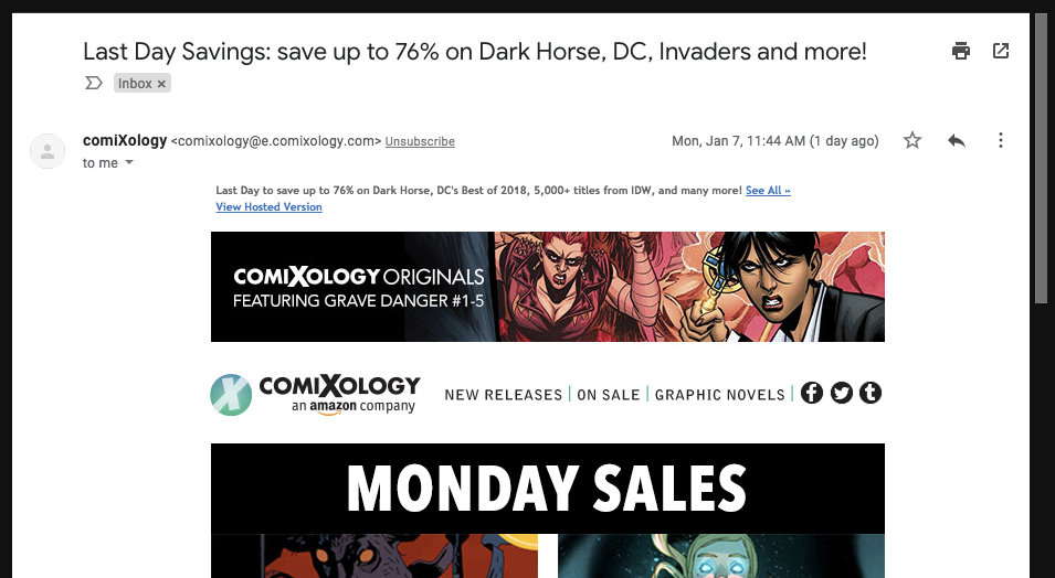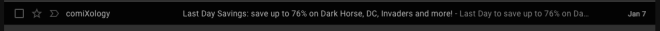 Here’s an example from ComiXology. Their preview text is “Last Day to save up to 75%…