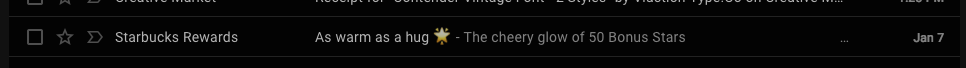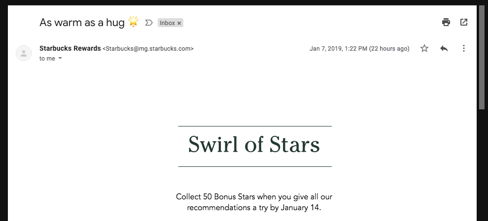Here’s a great example from Starbucks. Their preview text is “The cheery glow of 50 Bonus Stars.”
