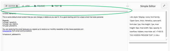 style="display: none; font-family: 'Open Sans', Arial, Helvetica, sans-serif; font-size: 1px; line-height: 1px; max-height: 0px; max-width: 0px; opacity: 0; overflow: hidden; mso-hide: all;"- This code WILL appear in the simple editor and cannot be removed in order for this to work. If someone else will be editing the preview text, you’ll need to educate them on only editing the text inside of the div and how to access this region