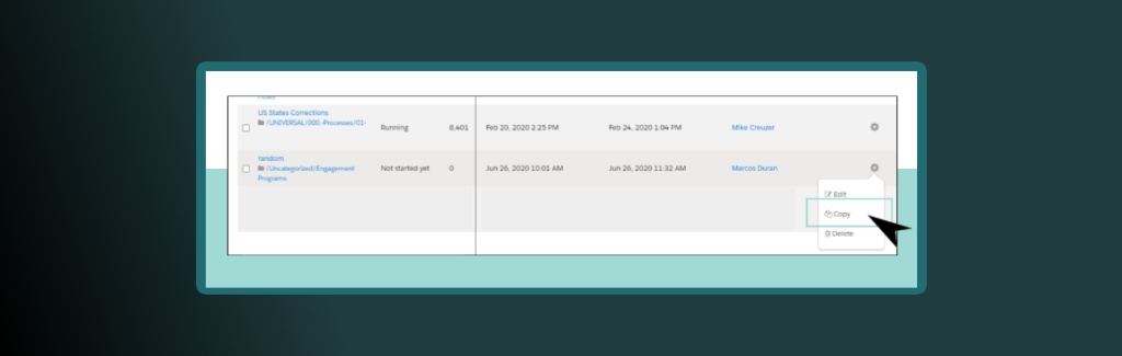 I like to think of this use case as building off of an Engagement Studio program template. You did the hard work already so instead of rebuilding it, why not duplicate it? Use the copy feature (in your list view of Engagement Studio programs) to make a copy of a previous program. Again, just remember to replace the assets. This can be very useful for webinars, events, and customer/constituent communications when the structure stays relatively the same.