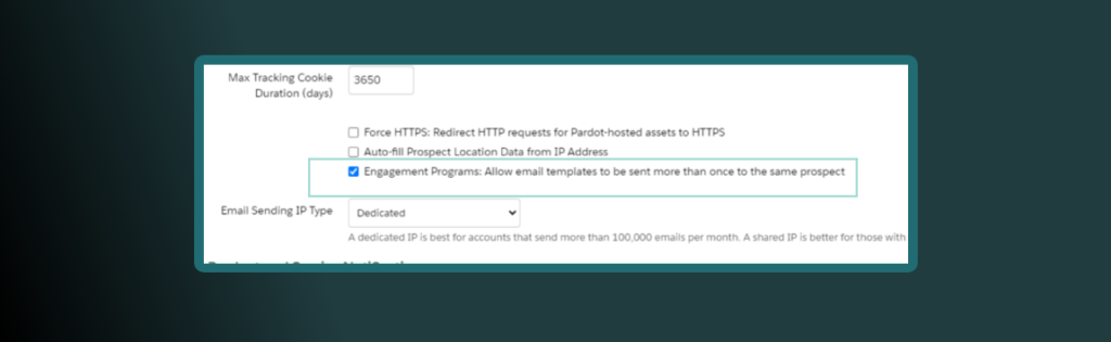 If your Engagement Studio program is set to repeat, prospects might receive the same email multiple times. You could also use the same template in multiple Engagement Studios. Although most accounts have this setting turned on, I would check under your account settings for the checkbox – “Engagement Programs: Allow email templates to be sent more than once to the same prospect” in order to enable you to send the same email template to prospects multiple times.