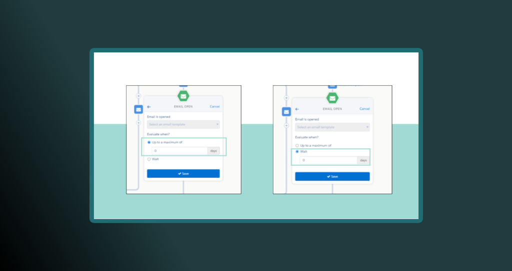 Think of the first option (up to X number of days) as a range (0 – X days). In this example, let X = 3 days. If someone completes the action that you were “listening” for within 1 minute up to 3-days timeframe, then that causes the prospect to proceed through the “yes” branch at that time. If at the 3-days mark (from the time they reach the trigger) the criteria is still not true, then the prospect goes through the “no” path.
