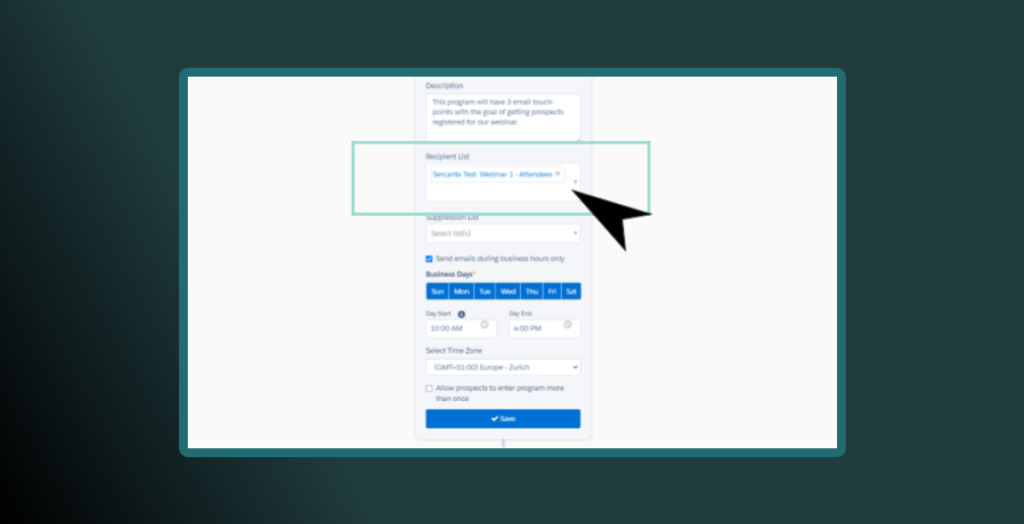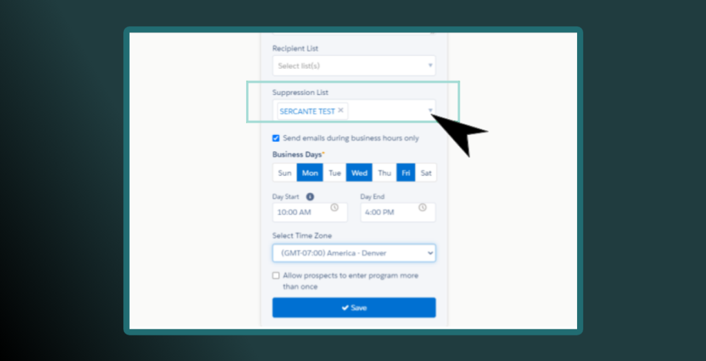 If prospects are part of the suppression list in the program, they will never enter the program and will not move through any of the steps. I like to add this to the criteria of the recipient list to avoid any issues (e.g. if duplicates are present). If you have anyone on your lists that are opted out or do not email they will go through the program but won’t receive emails.