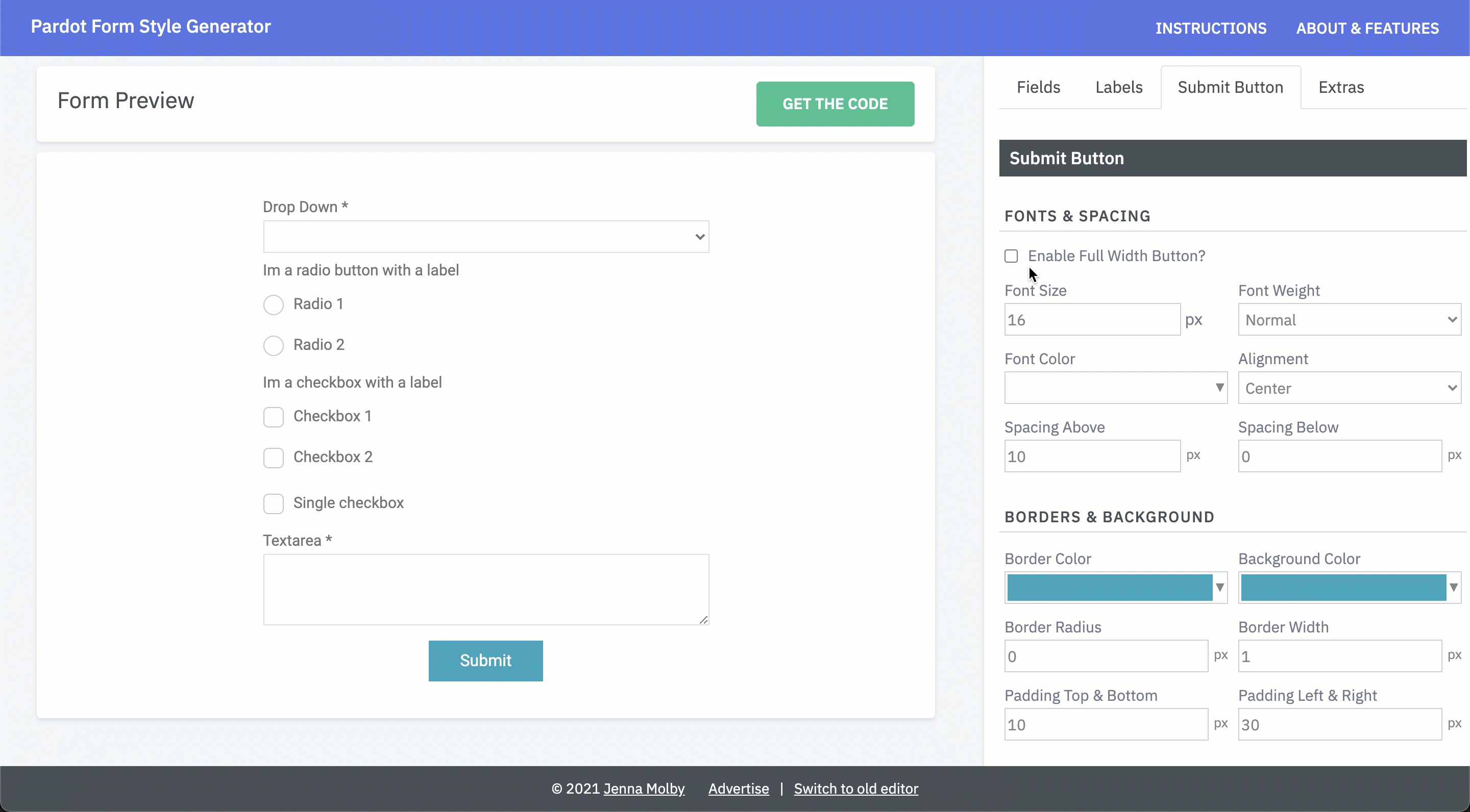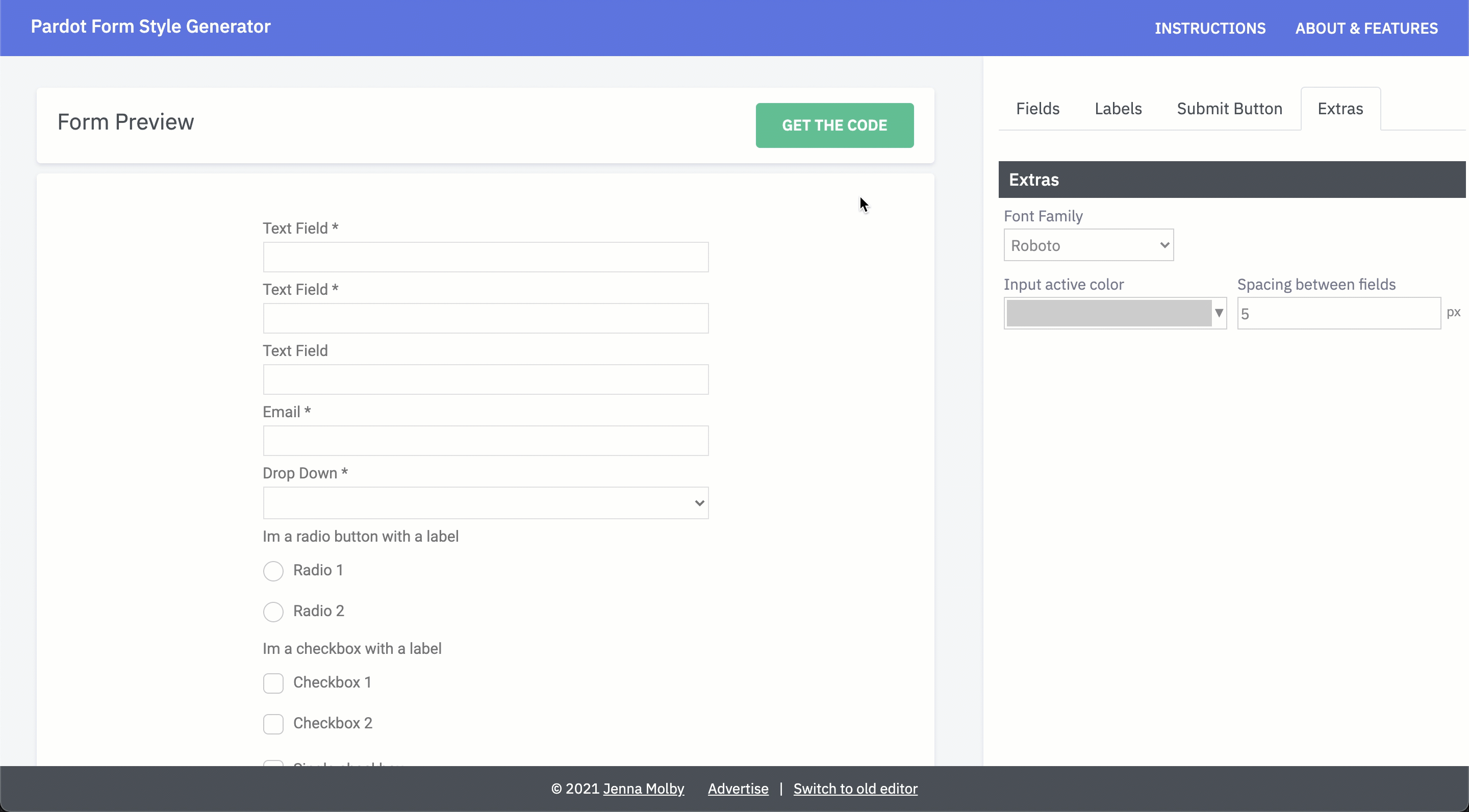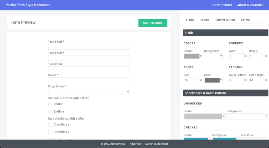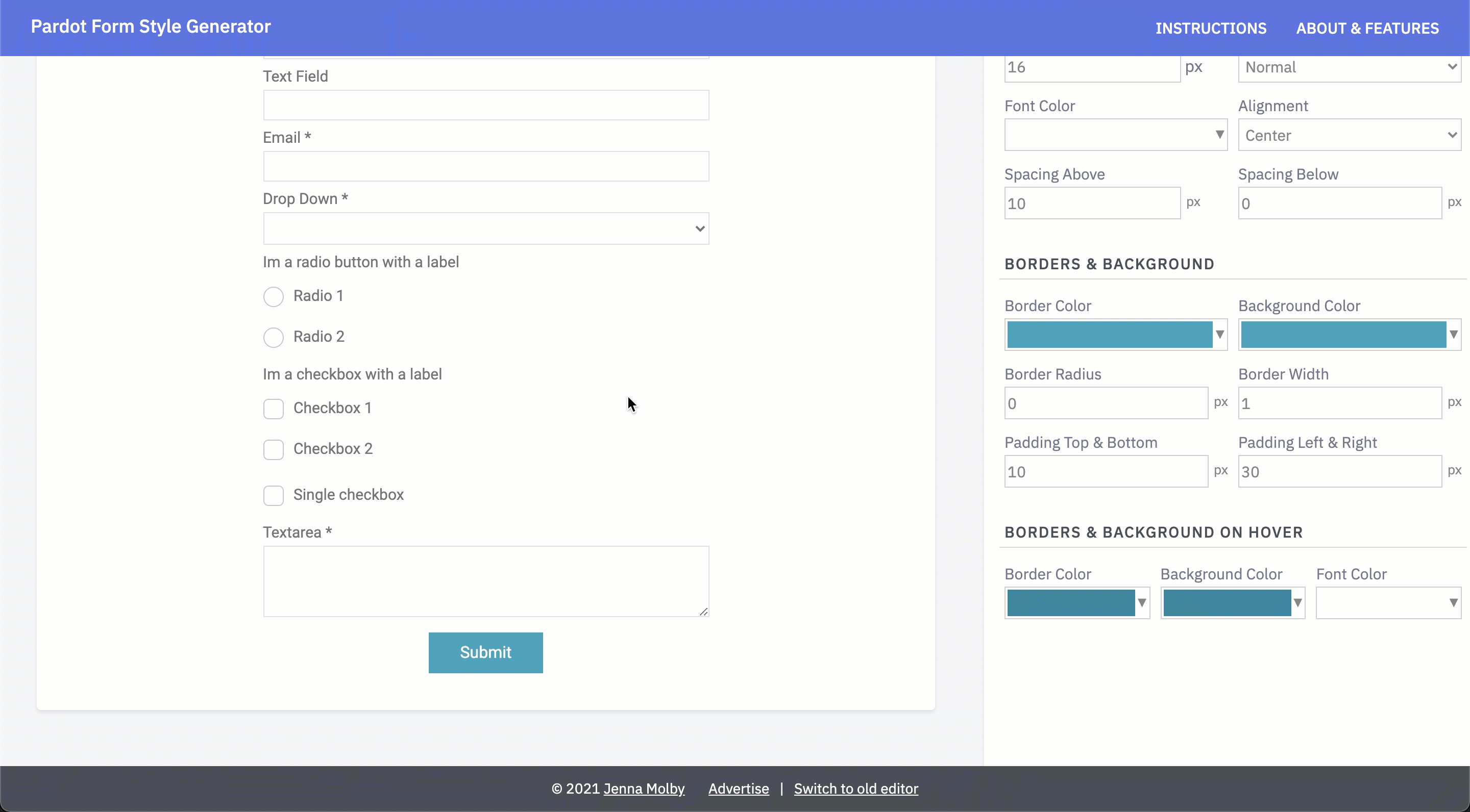 I’m so excited to finally launch version 2.0 of the Pardot Form Style Generator. With the new version comes a new UI and some cool new features, including customized checkboxes and radio buttons, embedded Google Fonts, new submit button options and more.