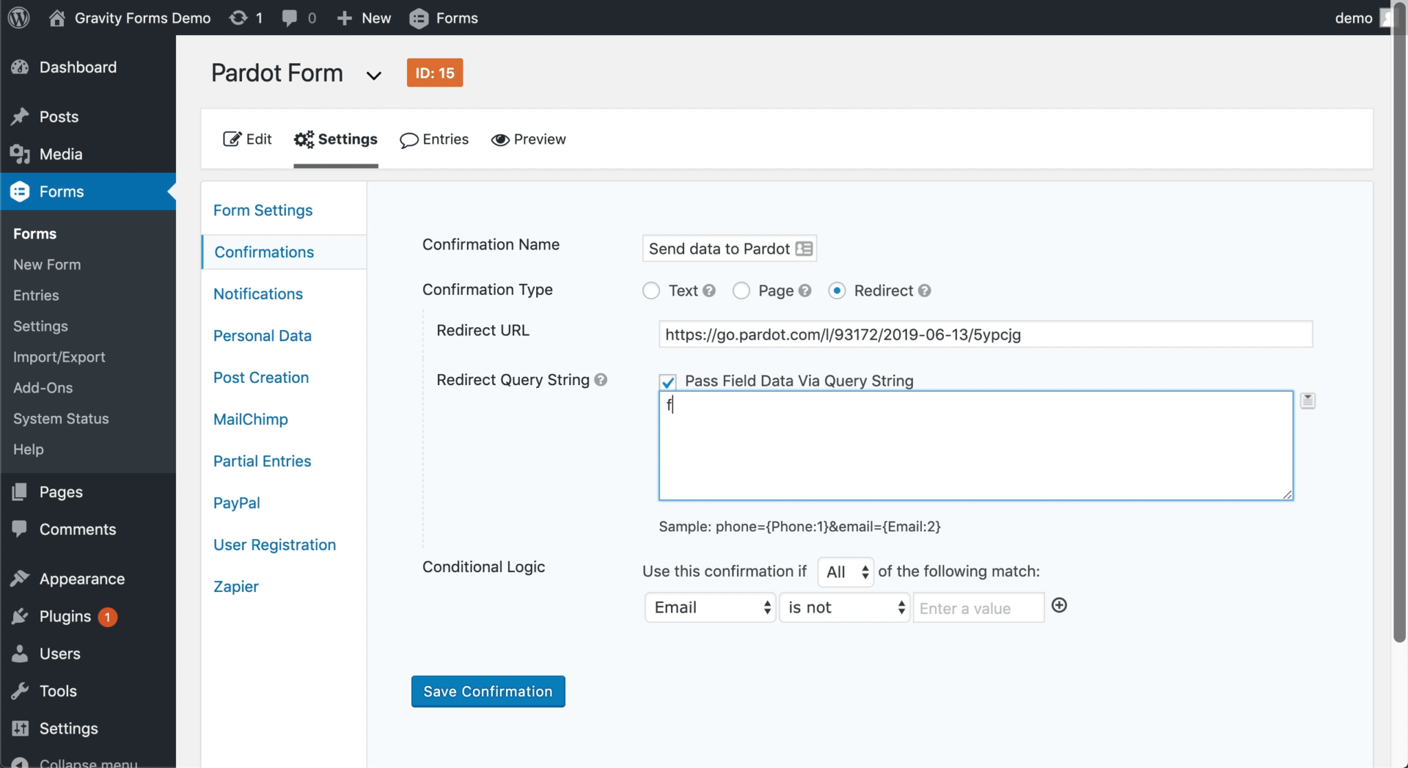 Now here comes the tricky part, in order for the data from the Gravity form to sync to Pardot, the fields need to be mapped. Select Pass Field Data Via Query String and a textarea will appear. This is where you will input the field names in your Pardot Form Handler and select the corresponding Gravity form field.
