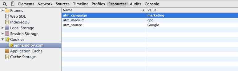 The cookies utm_source, utm_medium and utm_campaign should be visible in the console.