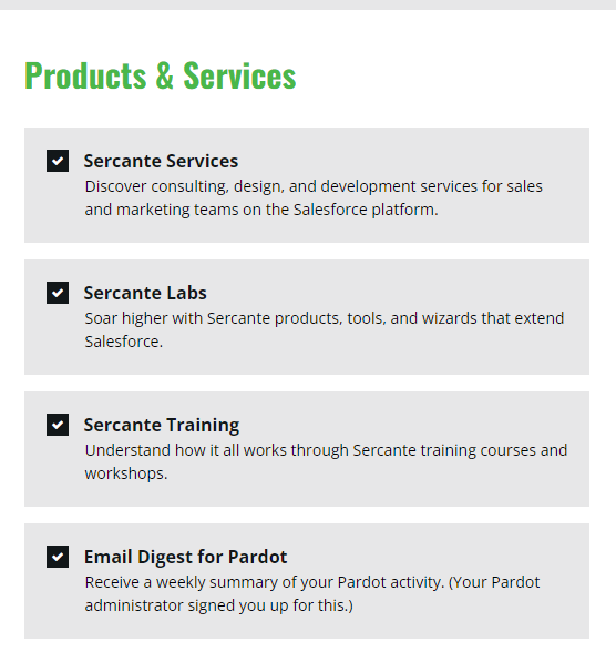 Ensure that your Email Preference Center offers a variety of targets, including product interests and types of communication. For example, the Sercante Email Preference Center allows email subscribers to sign up for only emails related to the services that interest them, like Salesforce consulting, integrations, or training.