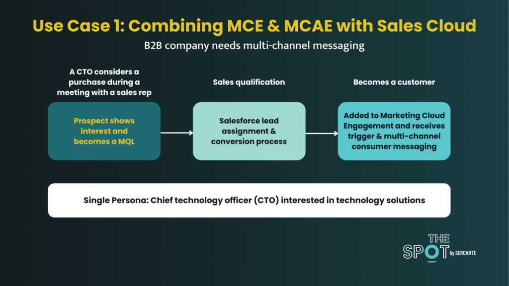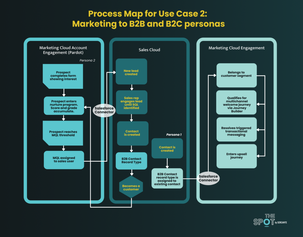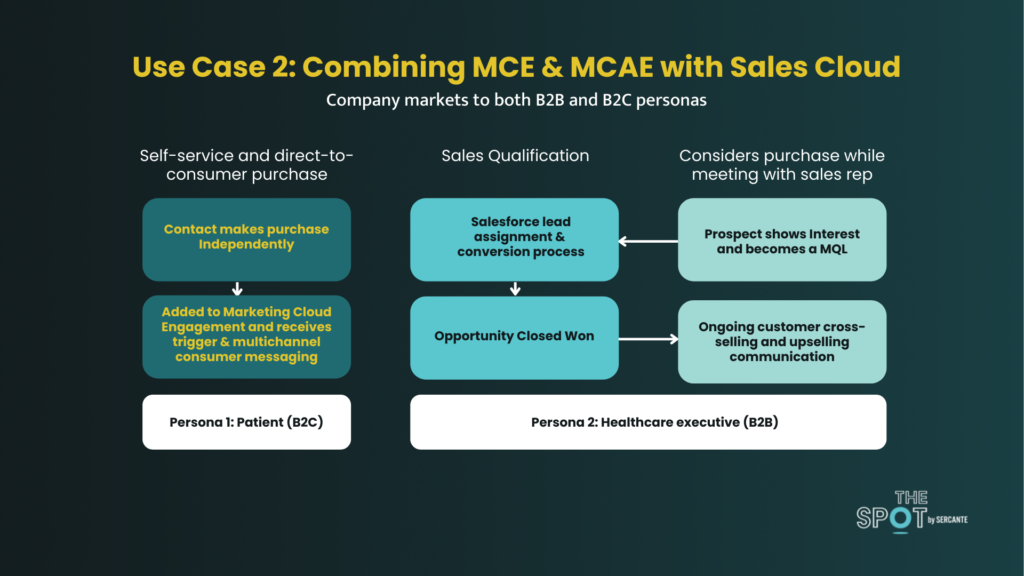 A hospital technology organization has two business models that support two separate personas that do not overlap. In this scenario, because of the way the organization is structured a single persona and contact is messaged only from Engagement or Account Engagement (Pardot). There is no sharing of contact and messaging between these solutions, and it’s therefore more straightforward.