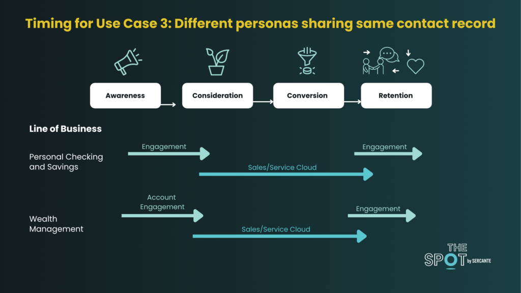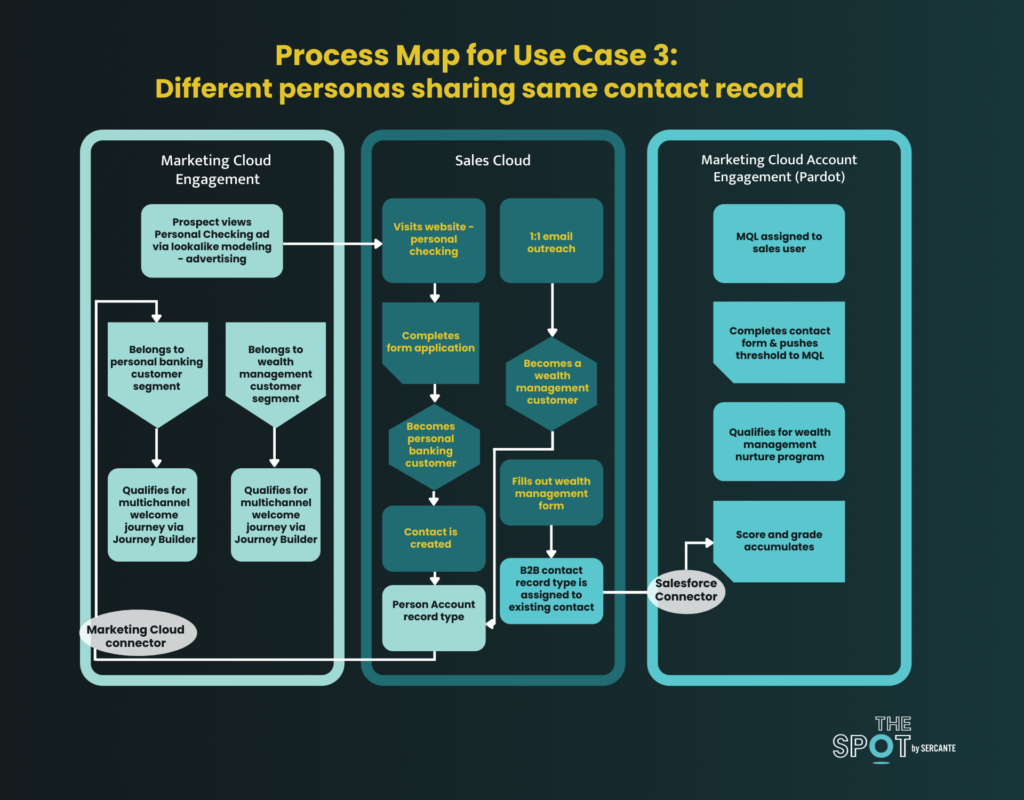 - In this case above, the potential customer gains initial awareness and exposure of the Personal Checking/Savings product through lookalike audience modeling fueled by Marketing Cloud Engagement & Advertising.