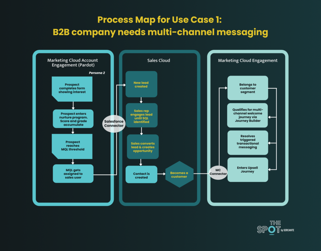 As described above, we’ve got a traditional B2B tech organization focused on a single persona that typically only applies to one contact record type. They’re looking to adopt more complex multi-channel messaging once their prospects become a customer.