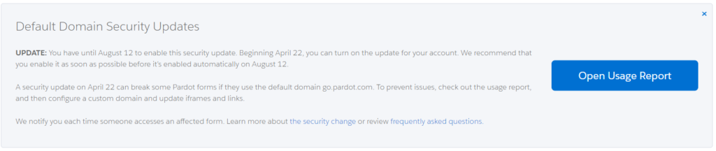 Pardot is making security enhancements that can affect users of the go.pardot.com domain who use this domain for iFrames. That means you’ll have to take action by April 22, 2022, to update your website forms that meet the criteria outlined in this blog post.