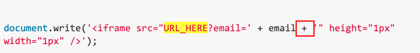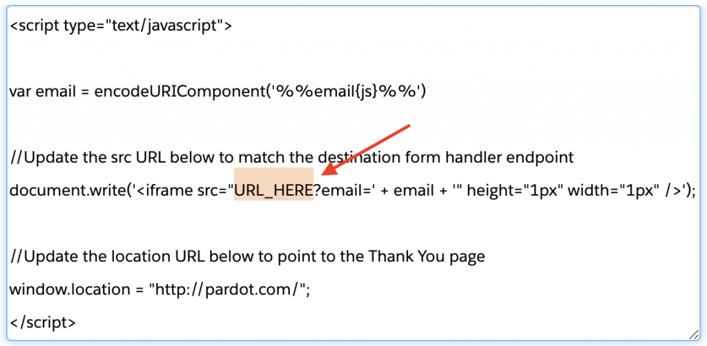 //Update the src URL below to match the destination form handler endpointdocument.write(‘<iframe src=”URL_HERE?email=’ + email + ‘” height=”1px” width=”1px” />’);