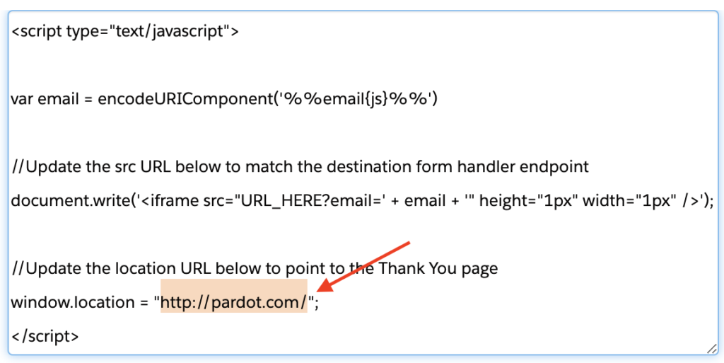 Now you have a fully configured script that will pass the email address to a form handler url. Optionally you can add in additional fields to capture in this submission. To do so, navigate back to the Pardot thank you code section. You’ll want to add in additional variables, one for each additional field you’d like to send to the form handler. First add in the variable tags and then update the encoded url framework.