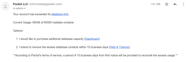 This messaging can seem very urgent and dire if it’s your first time getting notifications like these, but Pardot is actually pretty nice and helpful when it comes to managing your limit.