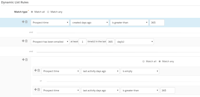 To review this, pull a dynamic list of people you’ve had on your list for over a year, who you’ve emailed at least once, who have either never been active or haven’t done anything in over a year. That rule criteria should look a little like this: