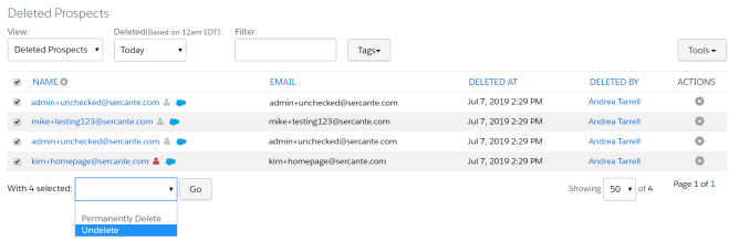 If a Prospect returns to your site and fill out a form while they’re in the Bin, they’re resurrected from the dead — and all of their history and visitor activity is saved. If a sales user hits “Send to Pardot” in Salesforce, this will also resurrect them. And a Pardot admin can also restore them en masse from the Recycle Bin ivew.