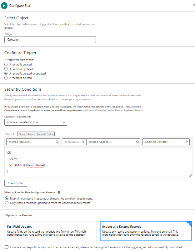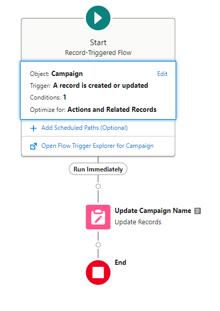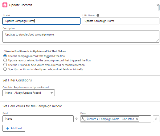 This a straightforward record-triggered flow based on the campaign object that updates the name field on the campaign with the value from the Campaign Name – Calculated field.