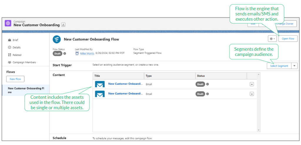 Marketing Cloud Growth uses the standard Salesforce campaign object, but the look is different when accessed from the Marketing app. The campaign is divided into sections containing the flow, start trigger, and content. This makes it easy to access everything in one place.