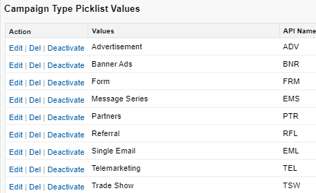 1. Customize Type picklist values and update API names to 3-digit codes (these are what will be included in our campaign names)