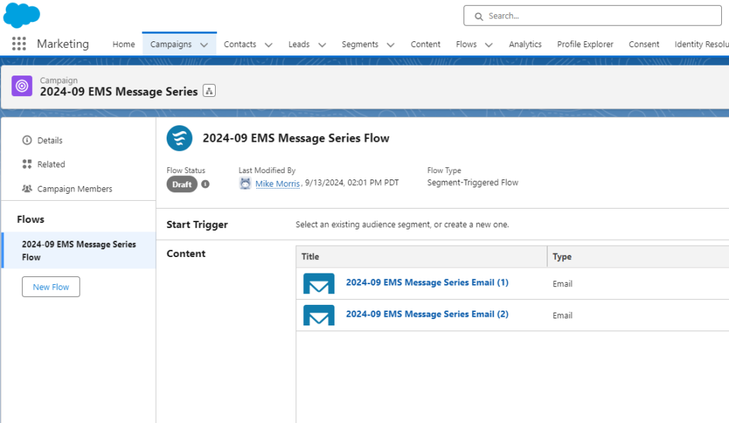 If you have not played with Marketing Cloud Growth yet, let’s set the stage. Marketing Cloud Growth has a very campaign focused workflow for creating new marketing initiatives. I really like this structure as all components are visible and accessible in a single location. This includes the content (emails/SMS messages/landing pages), segment, and the flow (this is a big change too – flows are used to send messages).