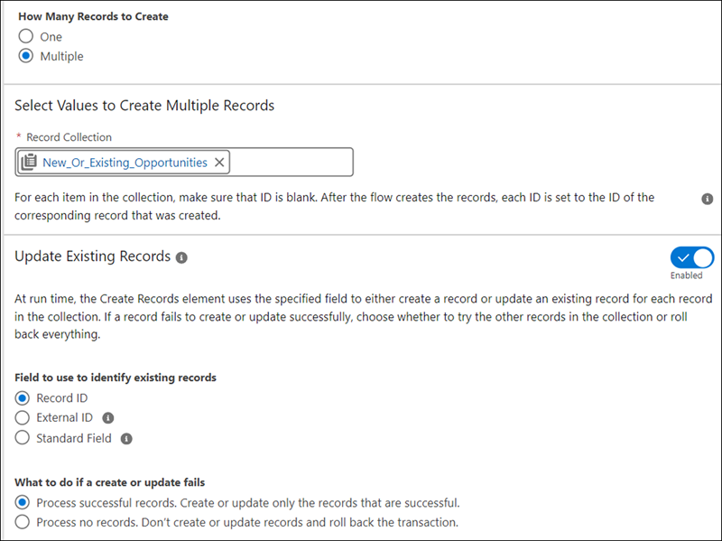 The Create Records element makes the process of saving records easier and faster, as you no longer check separately for existing records because the create and update elements are now merged into one element. Admins can now configure and maintain flows more easily while reducing potential errors from separate operations.