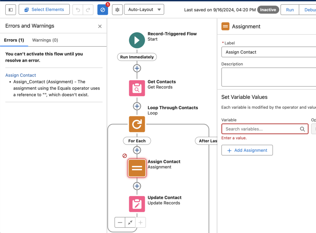 The new Errors and Warnings pane lists issues that prevent you from saving and activating your flow as you work in an easy to scan format. This feature will be automatically available when trying to activate a Flow with errors following the release.