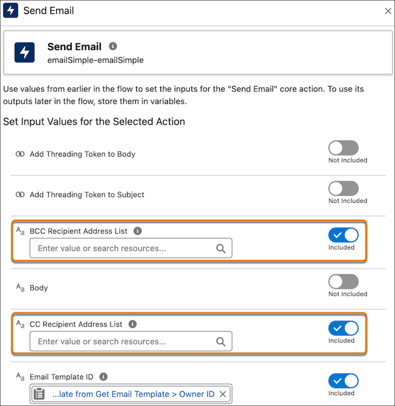 Two new enhancements have come to the ‘Send Email’ Action within Flow Builder. First, you are now able to include email addresses to include as cc or bcc on the email that is sent via the Flow. Any address entered in the CC field receives a copy of the email, and those in the BCC field also receive a copy, but their email addresses are hidden from all recipients. Secondly, there is an increase of the number of recipients you can include from originally 5 to now 150 recipients.