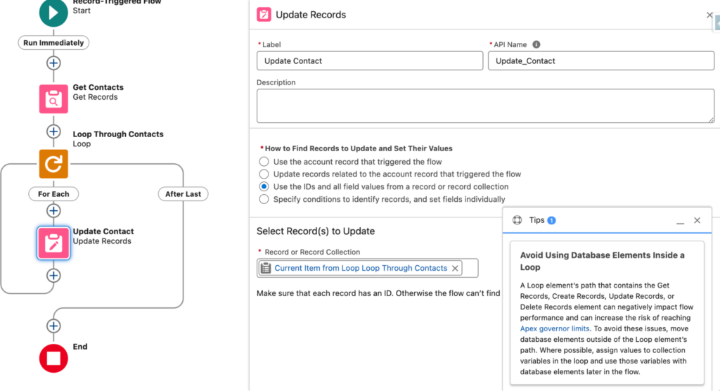 Another new feature within the Winter ‘25 release is the inclusion of new tips in Flow Builder to help you identify designs that can slow down your flows and increase the risk of reaching Apex governor limits. This may not seem like much to some of us that have been building Flows for a couple years now, but this is a game changer for new Flow builders who are uncomfortable with the tool at first.